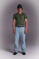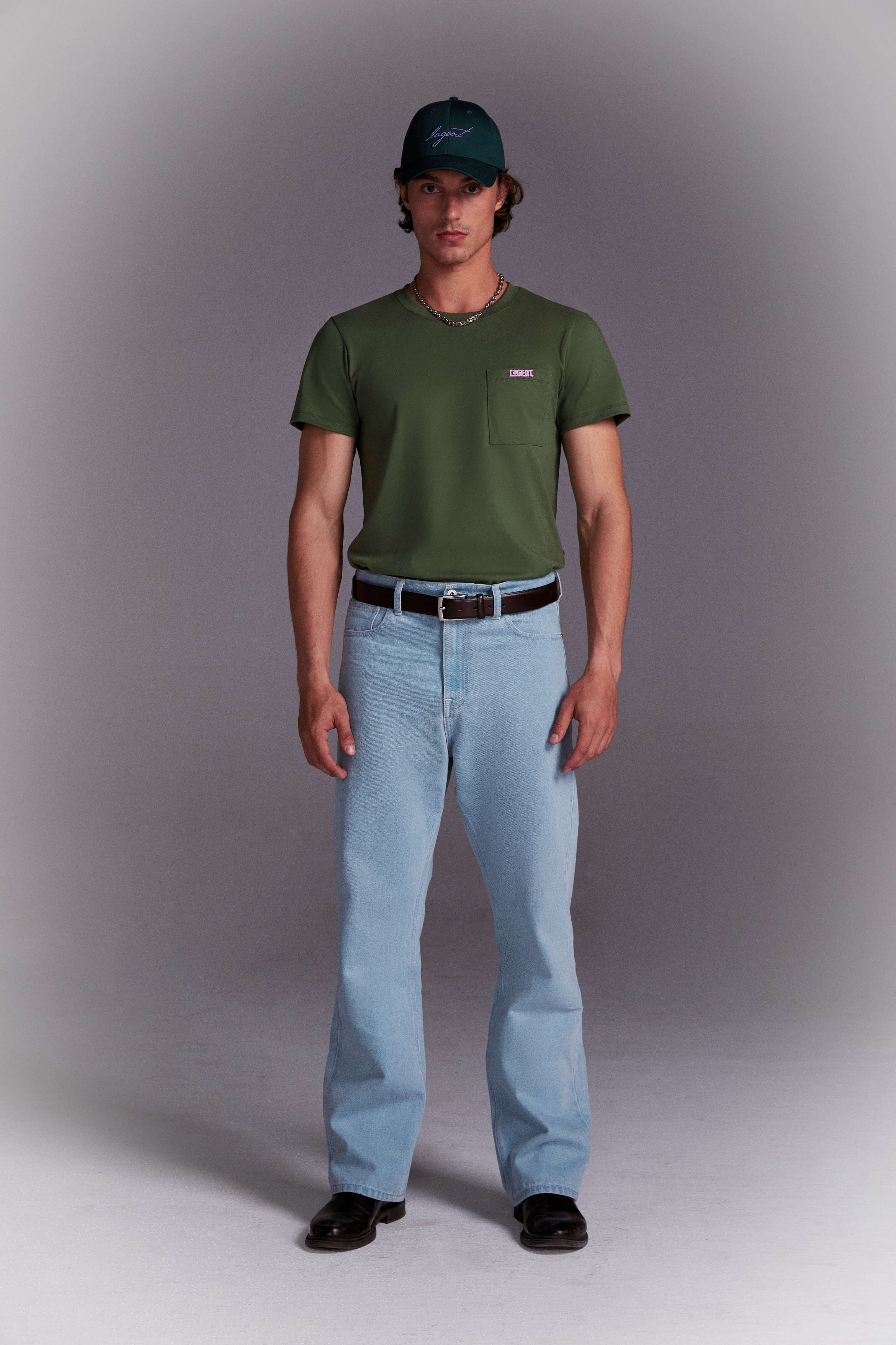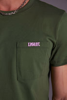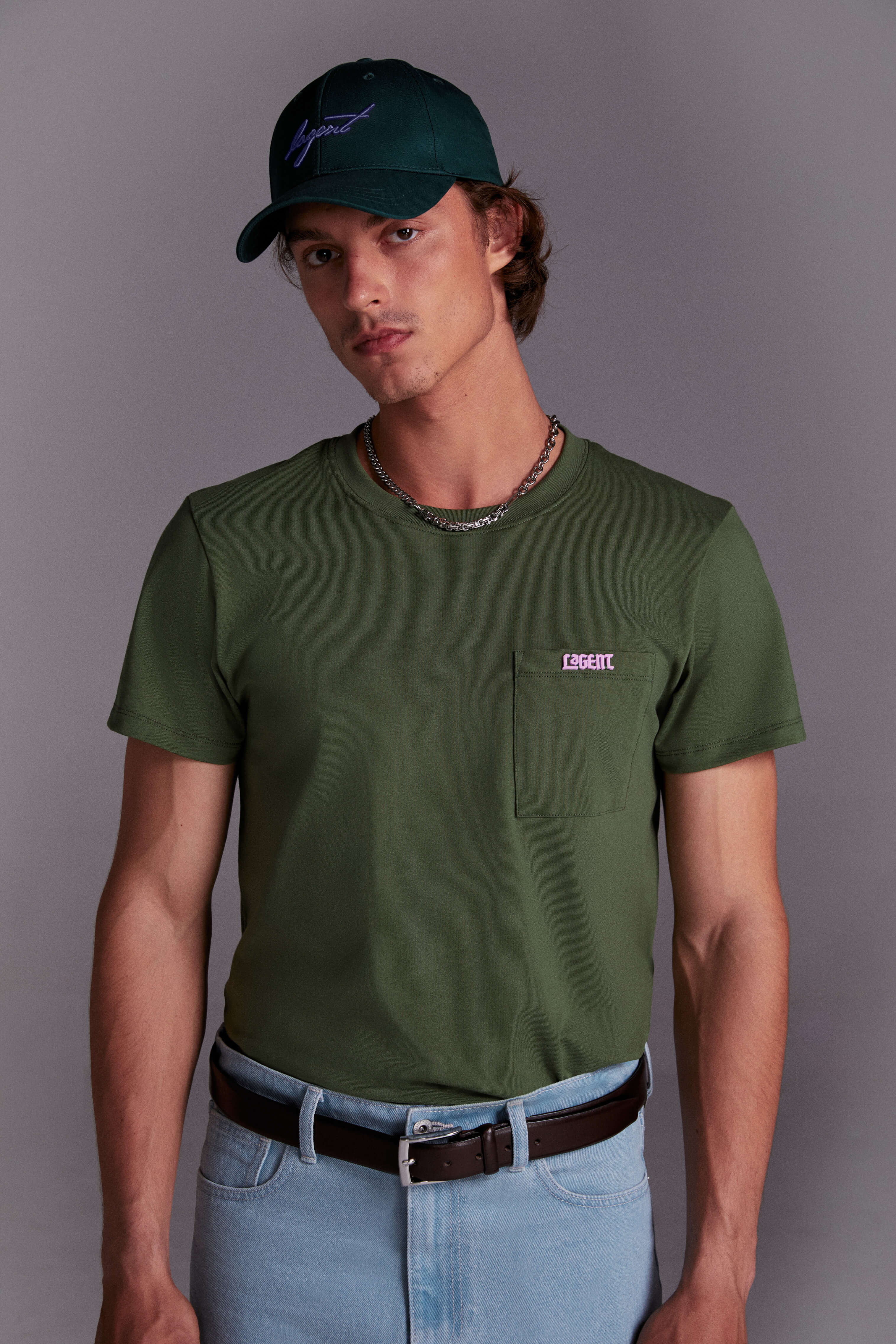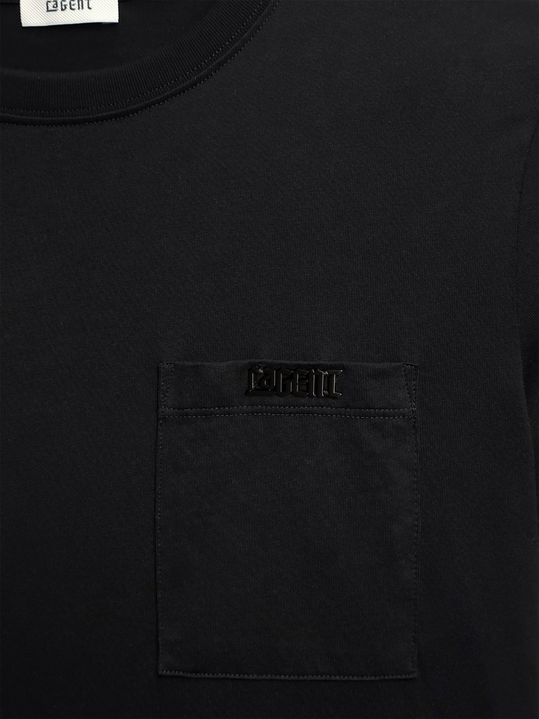 The metal plaque can be thrown like a boomerang. The only problem is that it’s sewn on too tightly to remove—much less open the pocket. LAGENT Metal Plaque Pocket T-Shirt is available in vineyard green and black.